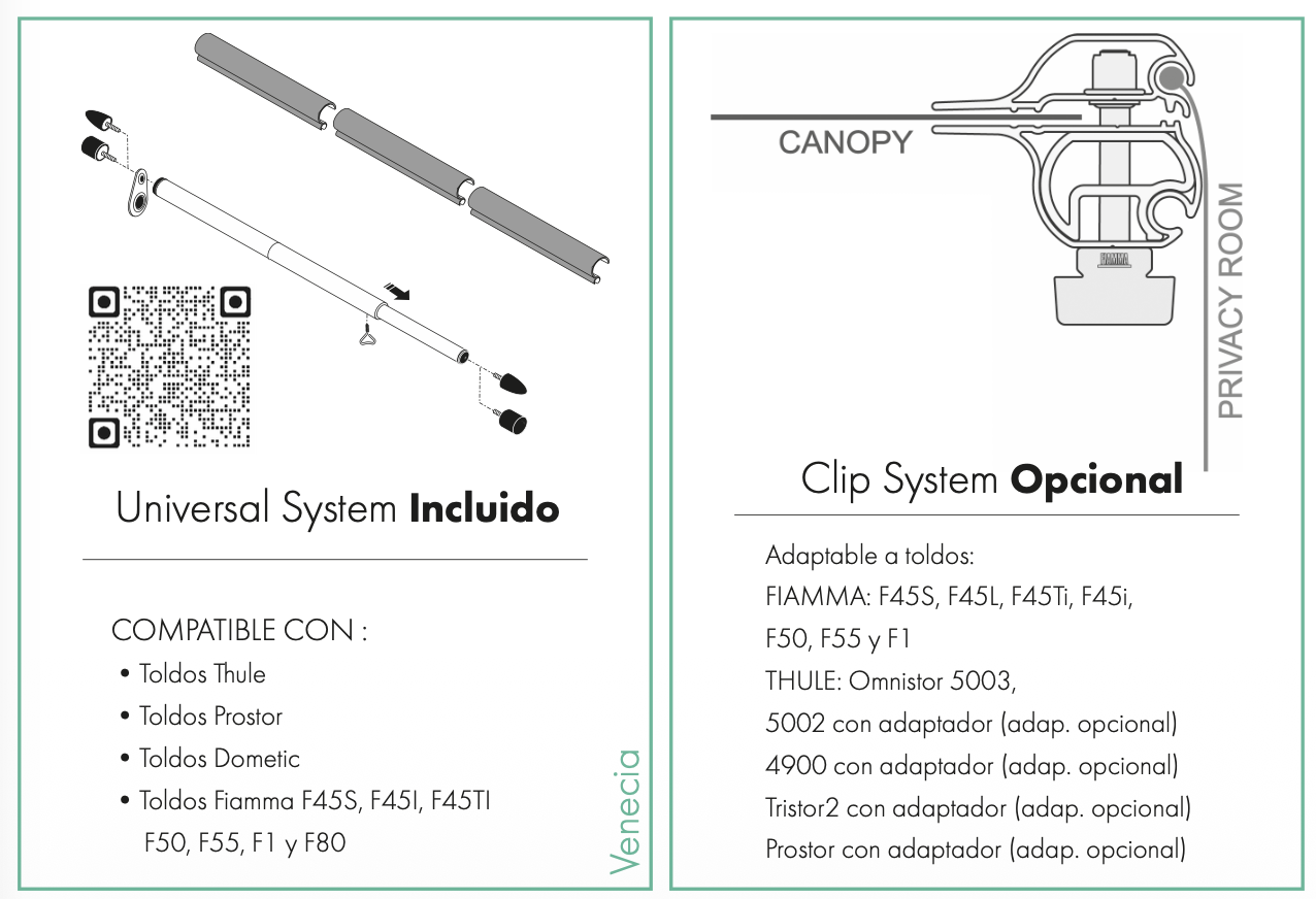 Para caravanas y autocaravanas bajas con rango de altura entre 230 y 255 cm. Los laterales y el frontal van conectados mediante cremallera, pudiendo ser desmontados dejando el frontal o los laterales separados. El frontal es de una pieza de 350 o 400 cm.